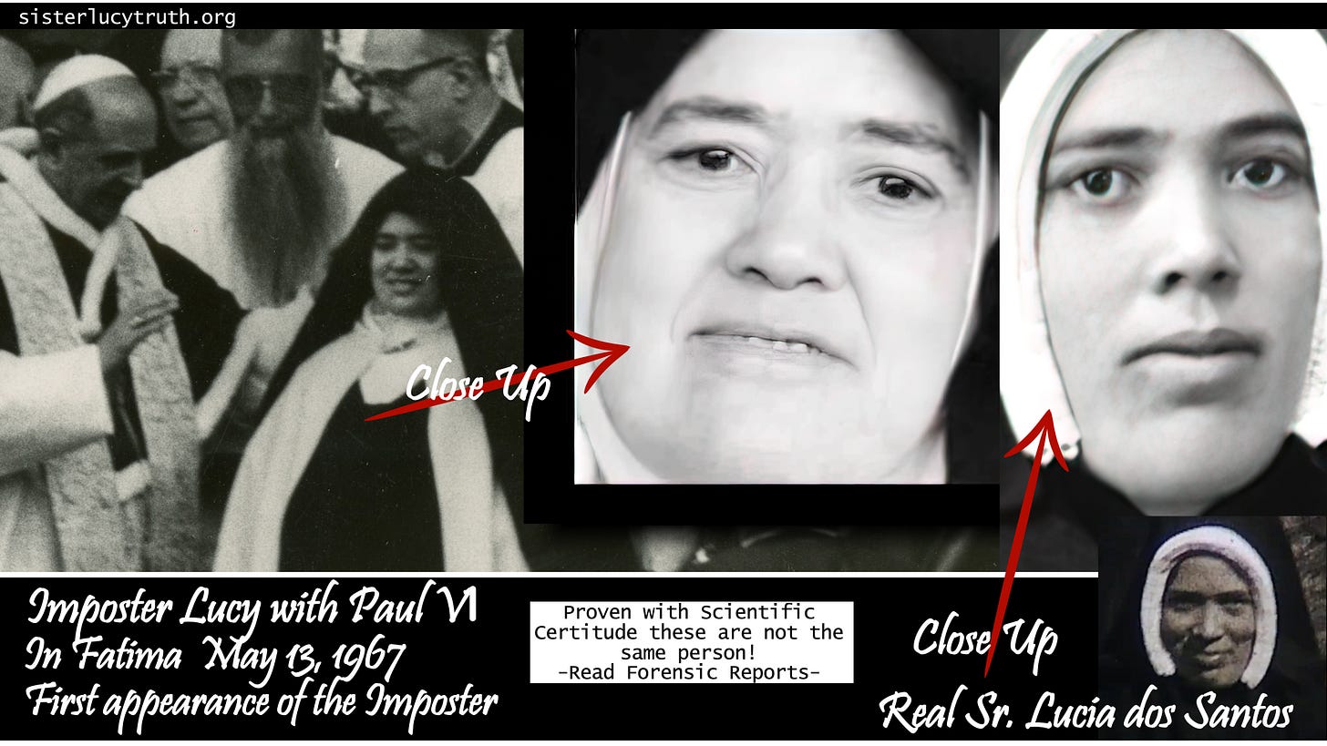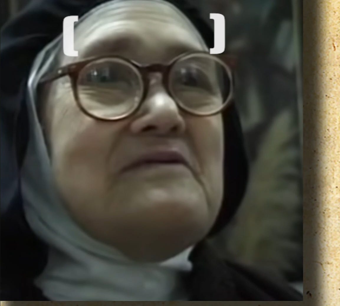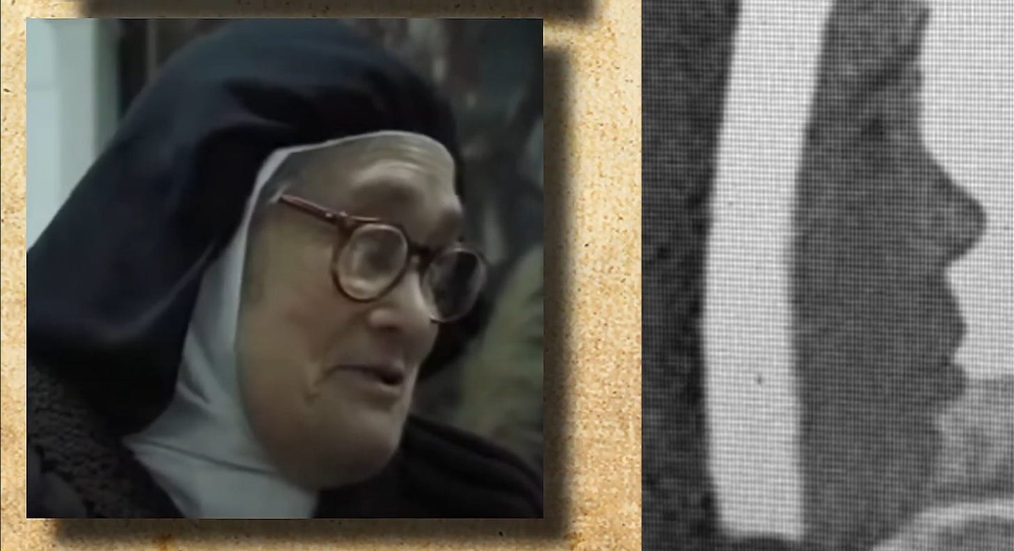 The film opens with this anatomy laid out plainly, and then places it directly beside footage of the woman known to Sister Lucy Truth’s investigation as Lucy II — the individual who appeared publicly as Sister Lúcia after 1967.