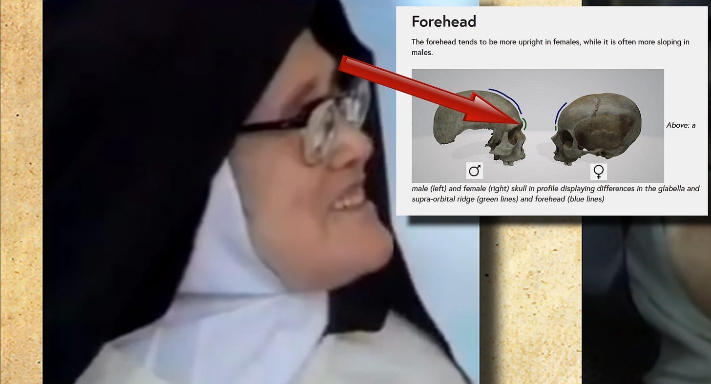 Then a red arrow appears on screen, pointing from the impostor Lucy’s profile directly to the male skull in the diagram. Not the female skull. The male skull — the one whose forehead slopes backward in the same direction as the forehead visible in the footage of the woman who appeared as Sister Lúcia after 1967.