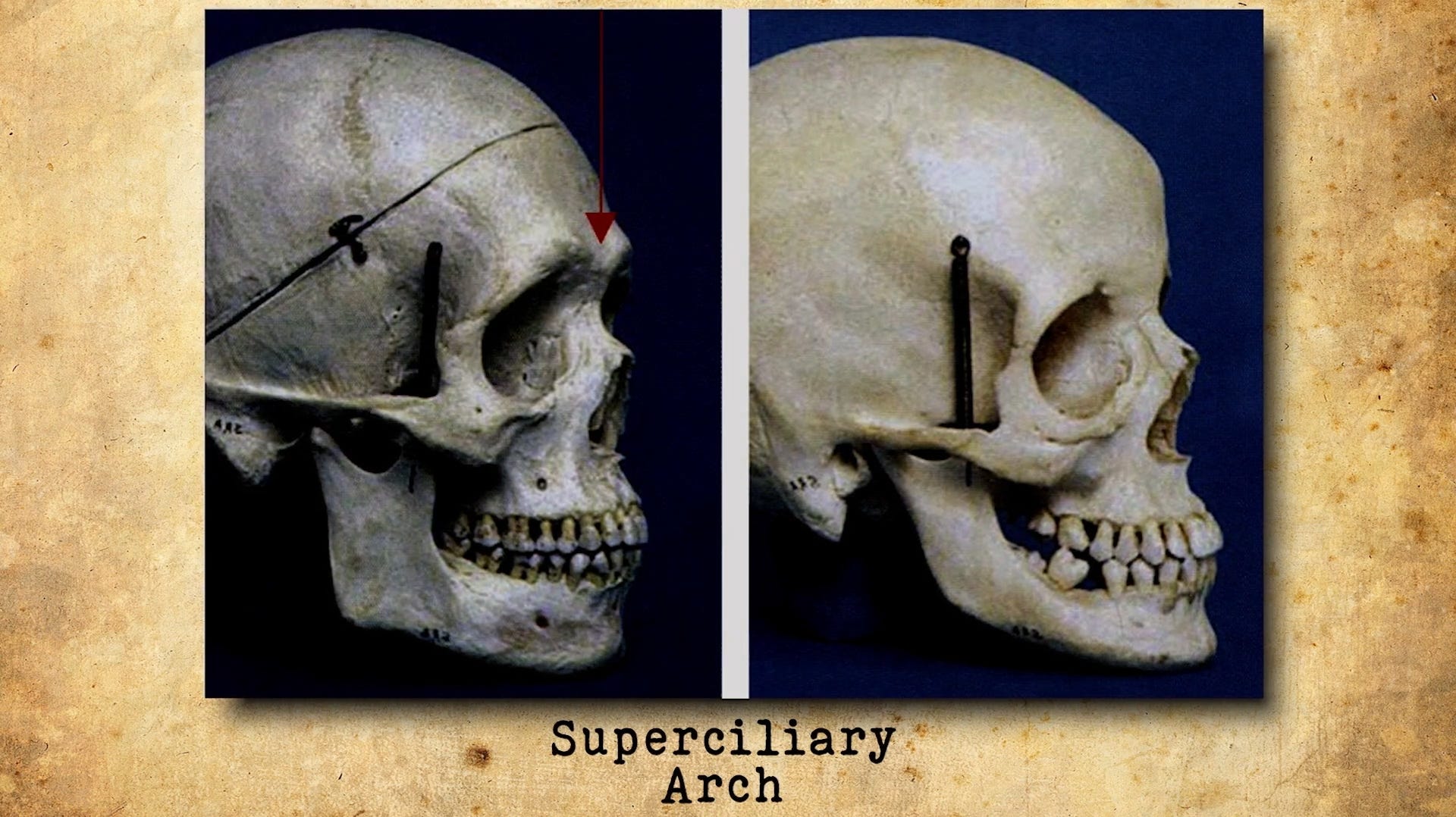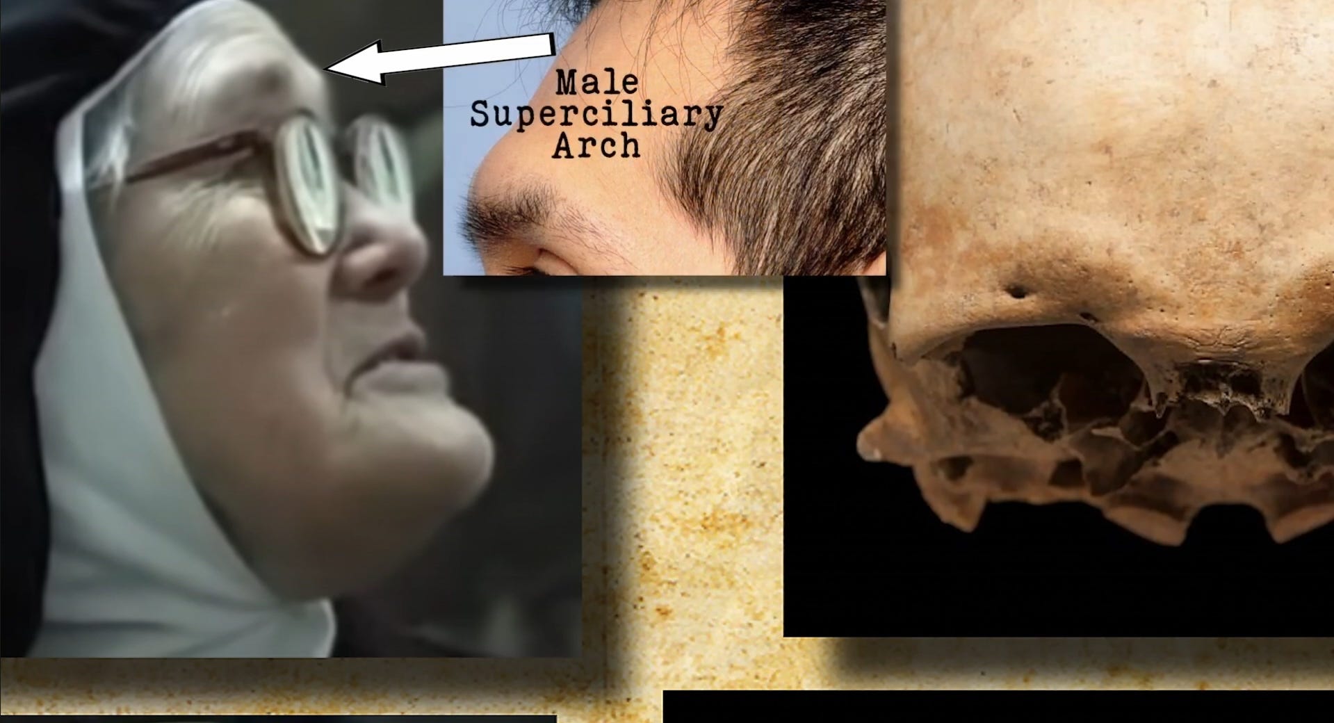 The central sequence of the film places three images alongside each other: the impostor Lucy in profile; a photograph of a male subject with his brow ridge labeled explicitly as “Male Superciliary Arch”; and skeletal reference material from anatomical sources. A white arrow in each frame points to the same landmark. The visual correspondence across all three is immediate and requires no explanation.