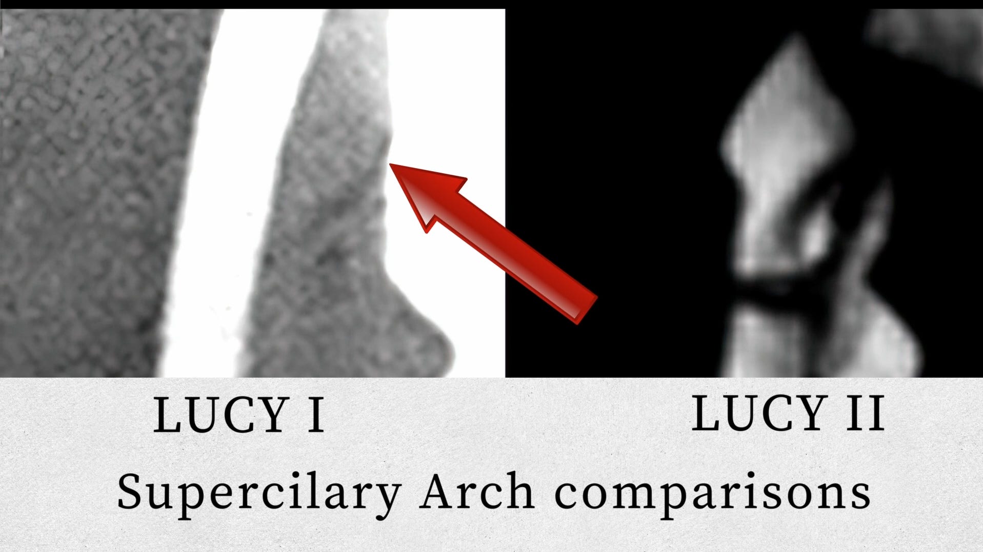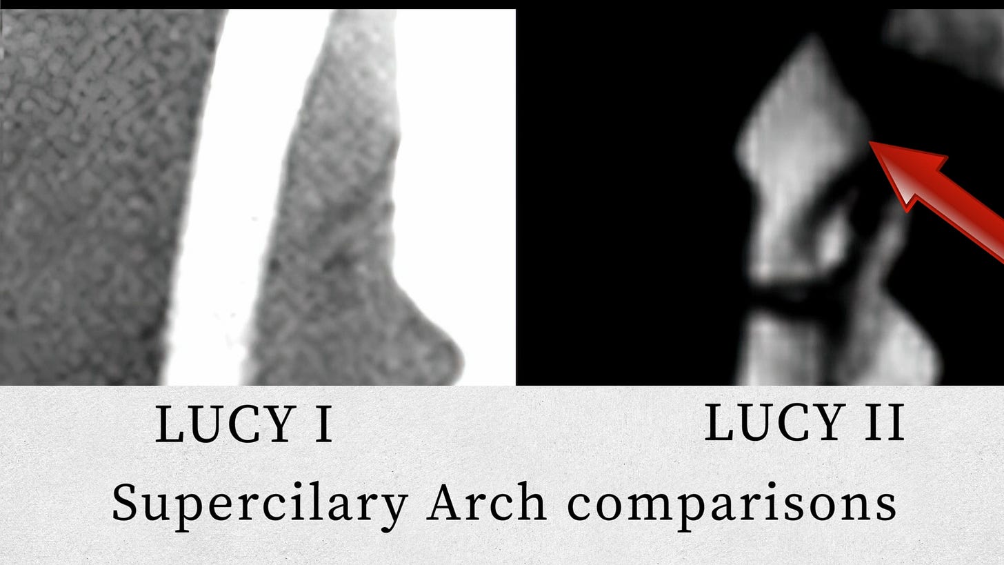 The narration at this point is spare: “The photo in the middle is a male showing his superciliary arch. Here we have the impostor Lucy, also known as Lucy 2, showing a very prominent superciliary arch.”