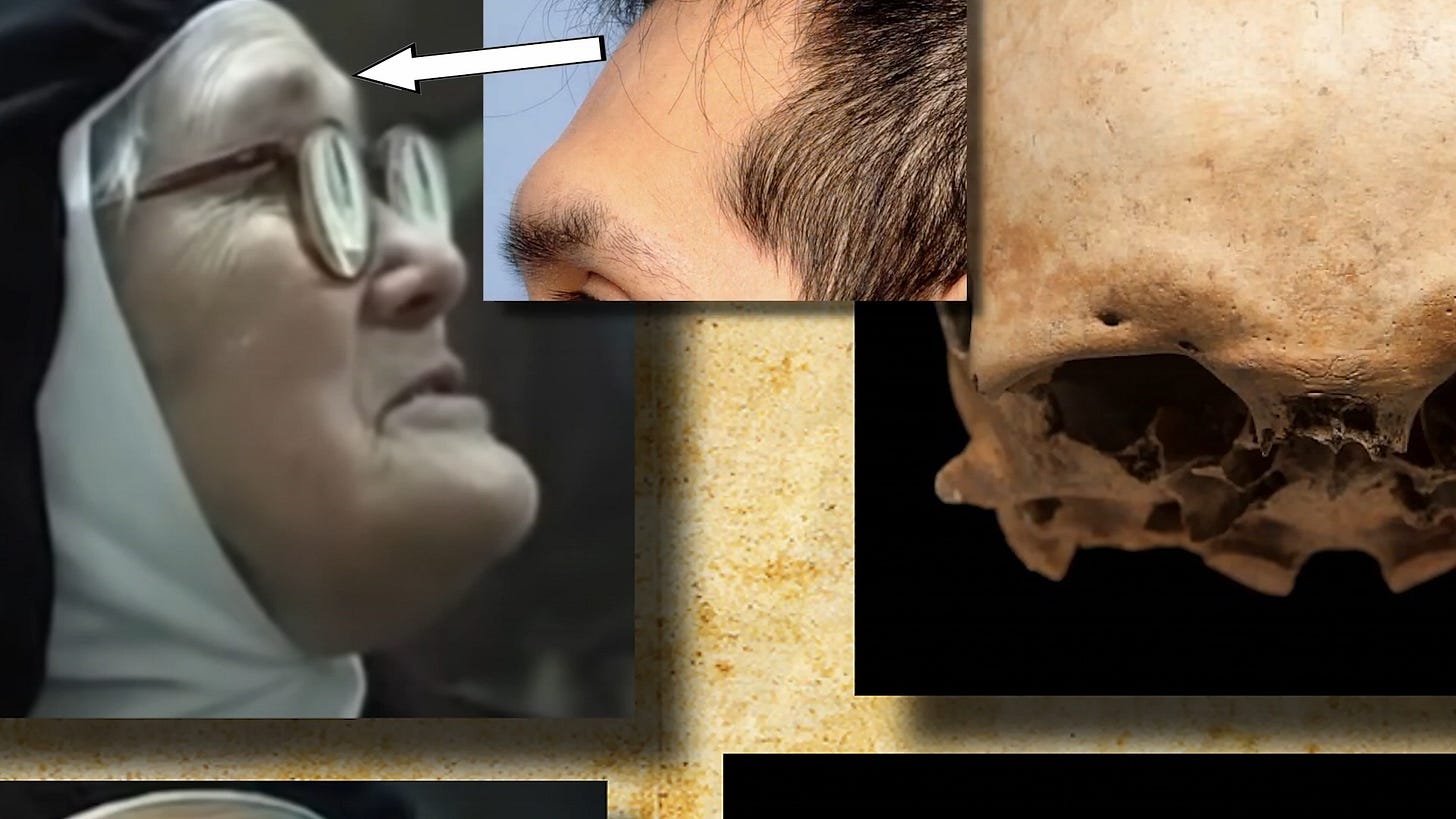 Lucy I’s forehead rises upright. Her brow ridge is flat and minimal, consistent with every photograph taken of the original Sister Lúcia before 1967 and consistent with normal female cranial morphology.