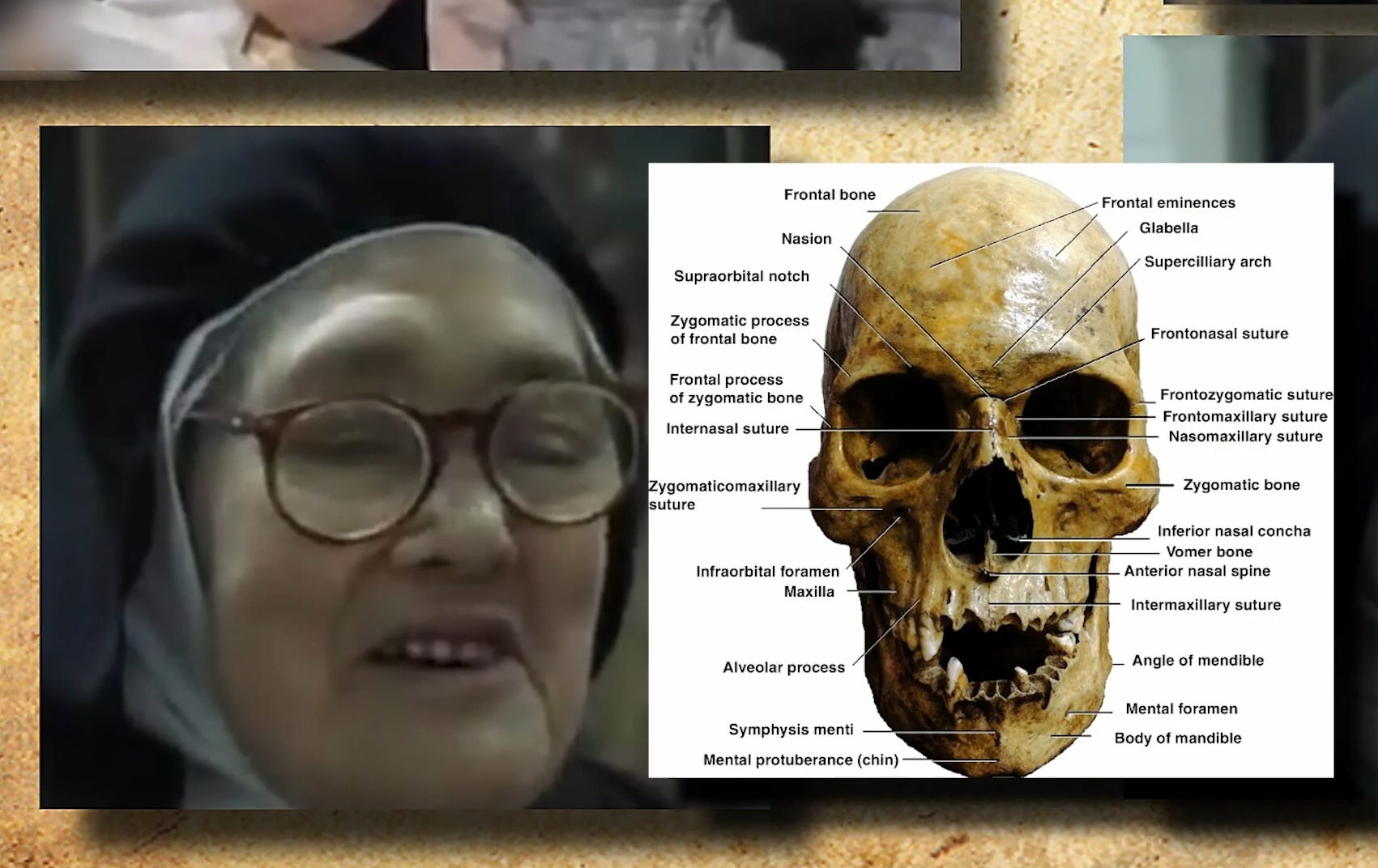 The film simply shows the profiles side by side and lets the chin speak for itself. Lucy I’s profile shows a modest, relatively flat jaw consistent with every pre-1967 photograph of the original Sister Lúcia. Lucy II’s jaw projects forward dramatically — in a direction that aging alone cannot produce, and surgery would require breaking bone to create.